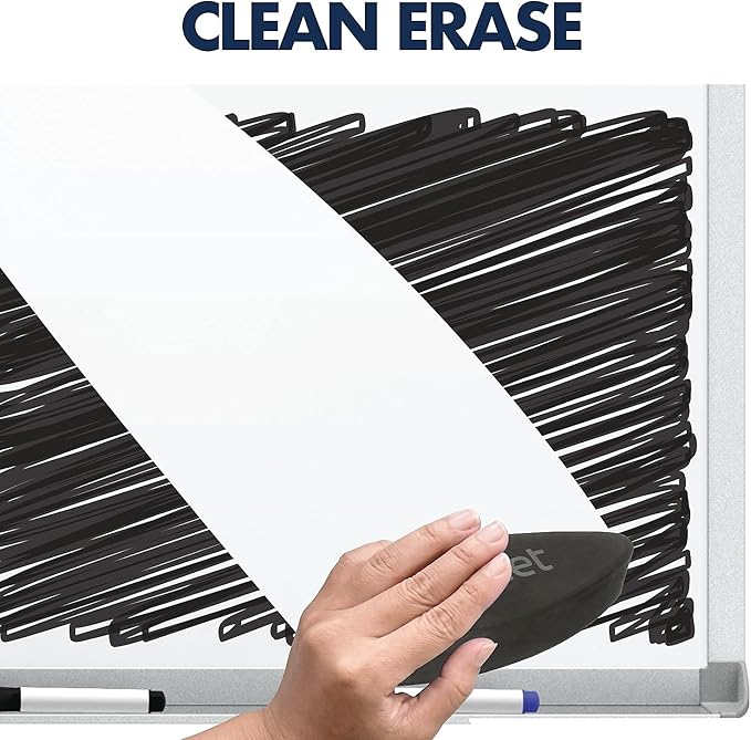 - CLEAN ERASE: Keep your board clean and legible with the easy to erase surface. The porcelain surface will not stain or ghost, so you can write, erase and rewrite on a clean surface, every time. Anodized, satin-finish aluminum