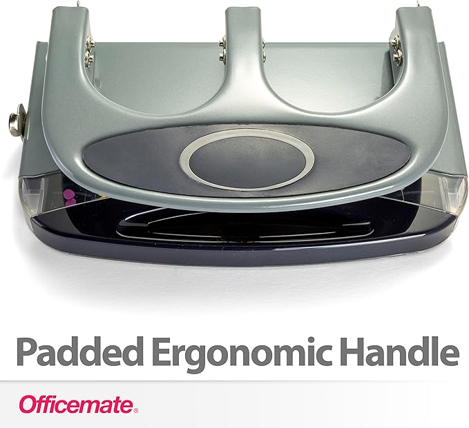 - Heavy-duty, three-hole punch with chip drawer and a padded ergonomic handle for high-volume punching needs