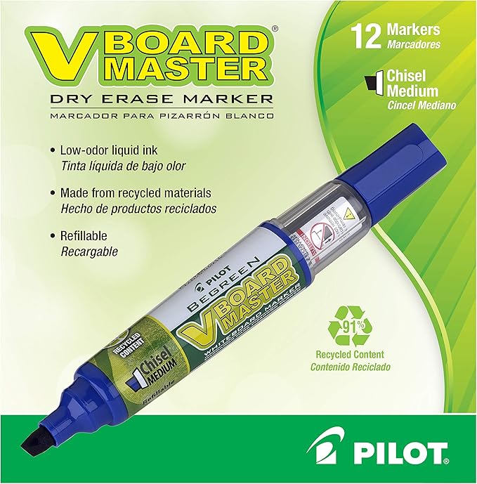 PILOT V Board Master BeGreen Refillable White Board Markers, Chisel Tip, Blue Ink, 12 Count