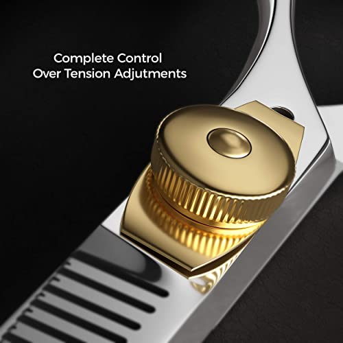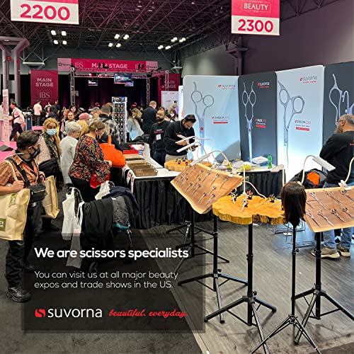 - π RAZOR SHARP WITH SEMI-OFFSET DESIGN: Suvorna's 6.5" semi-offset design reduces strain on your elbows and wrists, letting you cut for longer without discomfort. Our razor-sharp thinning shears for hair cutting effortlessly through hair, eliminating hair bending and pushing. Tension adjustment helps cut at your ease & large finger holes with rubber inserts suitable for both small and big hands. The hollow ground blades ensure clean snips, increasing cutting efficiency and facilitating precision cuts.