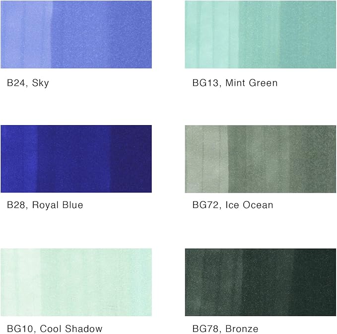 - This 6 piece Sea & Sky set includes a combination of blue and blue-green colors, B24, B28, BG10, BG13, BG72, and BG78. Perfect for creating oceanic scenes and water illustrations.