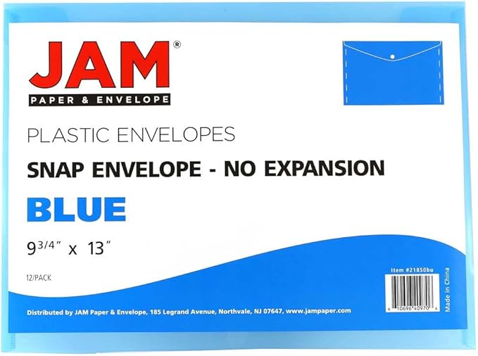 JAM PAPER Plastic Envelopes with Snap Closure - Letter Booklet - 9 3/4 x 13 - Blue - 12/Pack