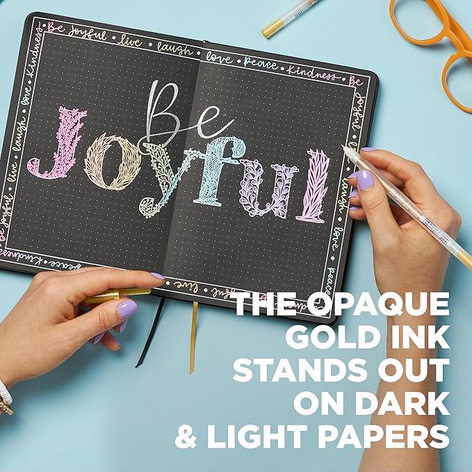 - Metallic, Opaque Gold Ink: Gel pens have metallic gold ink that flow creamy smooth onto light and dark paper