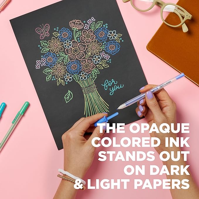 - Bright, Opaque Colored Ink: Gel pens have paint-like colored ink that flows creamy smooth onto light and dark paper