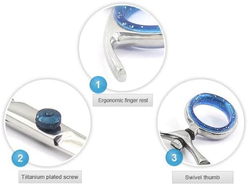 - 💎 Swivel Thumb Ring and Ergonomic Design: Tijeras para cortar cabello have a swivel thumb and non-slip handle with a finger rest that lets you cut at ease and more precisely. Our hair cutting scissors professional has an ergonomic design that prevents arm strains caused by repetitive motion when using this barber shears and scissors for hair cutting allowing painless hand movement with optimum control.