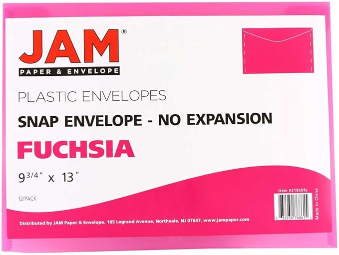 JAM PAPER Plastic Envelopes with Snap Closure - Letter Booklet - 9 3/4 x 13 - Fuchsia Pink - 12/Pack