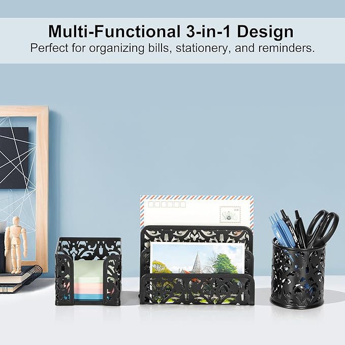 - 3 in 1 Office Supplies for Desk: The desk accessories set includes 1x mail organizer, 1x pencil holder and 1x sticky notepad holder. Our office supplies for desk is a great gift for holiday Christmas gifts, birthday gifts, party gifts, back to school gifts.