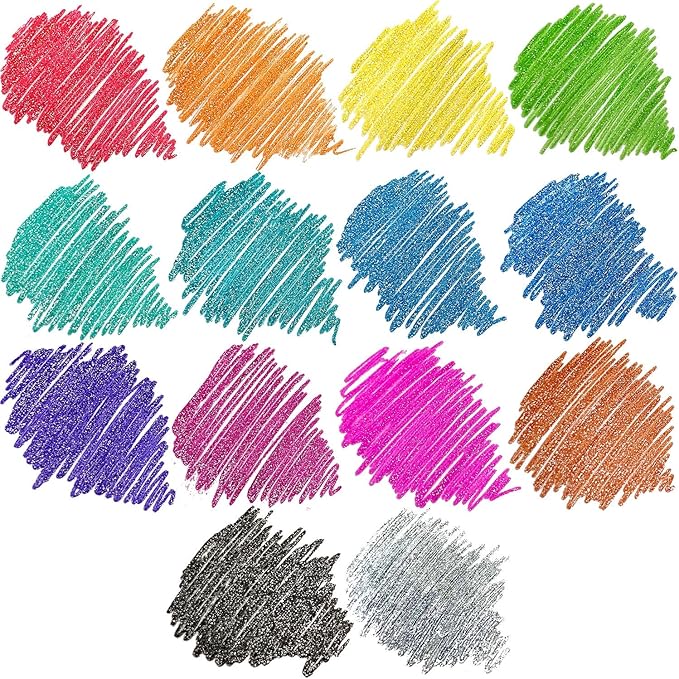 - Glitter Ink Colors for Bold and Sparkling Effects. This set includes shimmering shades that appear clearly on both light and dark paper—suitable for coloring, handmade cards, or decorative journaling.