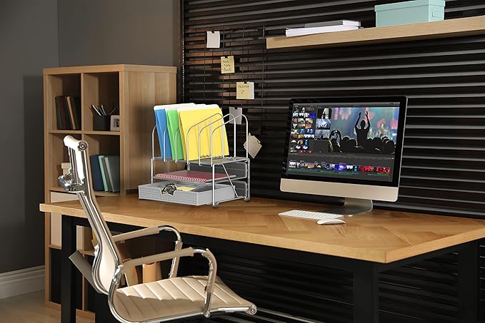Deco Brothers Desk File Organizer with Letter Tray and 5 Upright File Stand, Silver
