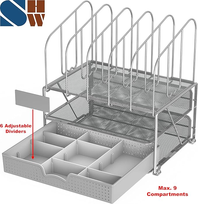- 1 sliding drawer with 6 adjustable dividers to organize office supplies.
