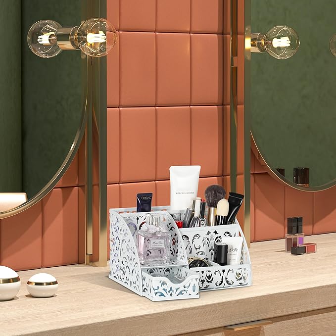 - Premium Metal Build: Made of metal with hollow flower patterns and anti-rust powder finished, this desk caddy combines elegance with functionality. Smoothed edges and a chip-resistant coating ensure long-lasting beauty.