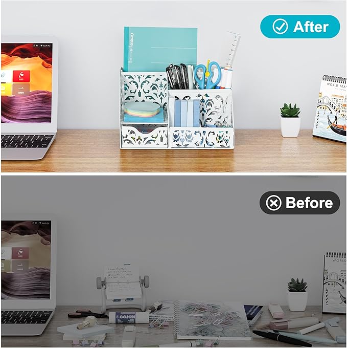 - Desk Accessories Organizer: The desktop organizer is suitable for pencils, cosmetics, and extra office supplies like painting pens, correction tape, scissors, and more, fit for bathroom necessities, toiletries, and even kitchen utensils.