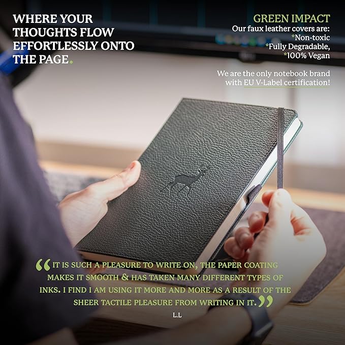 - HIGHEST-QUALITY WRITING PAPER: Dingbats Green Deer Medium A5 Notebook Journal has 192 pages-96 sheets of no bleed, smooth writing, Cream 100gsm, acid-free fountain-pen friendly, perforated plain paper in a flat lay design