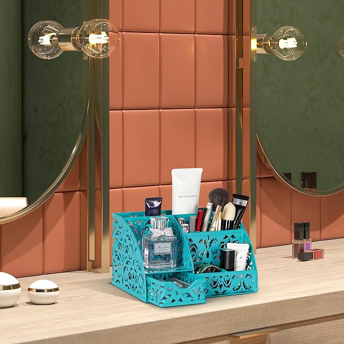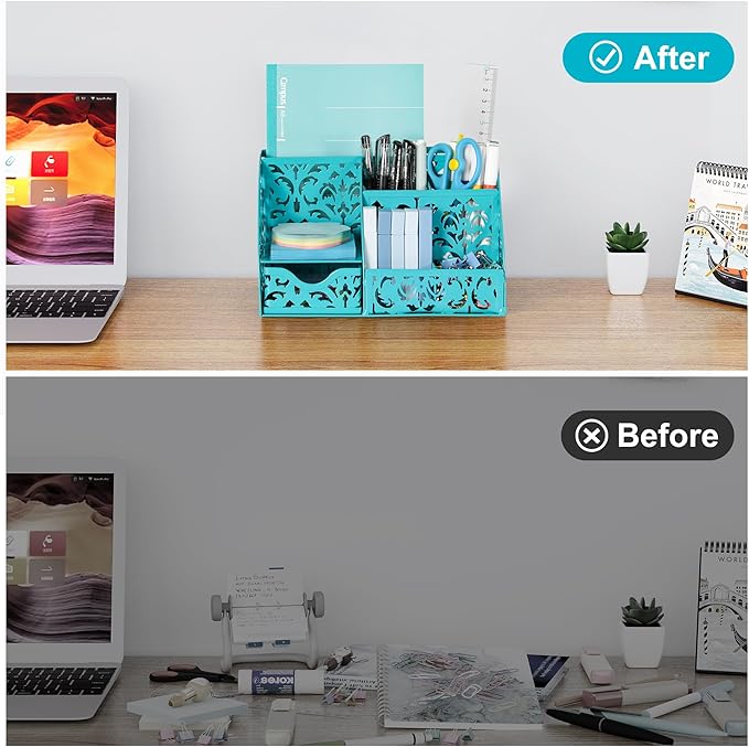 - Premium Metal Build: Made of metal with hollow flower patterns and anti-rust powder finished, this desk caddy combines elegance with functionality. Smoothed edges and a chip-resistant coating ensure long-lasting beauty.
