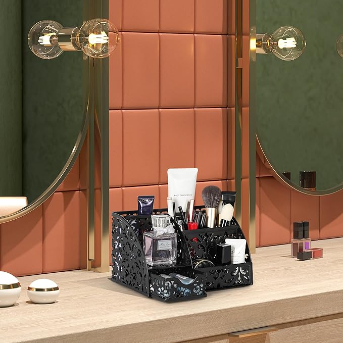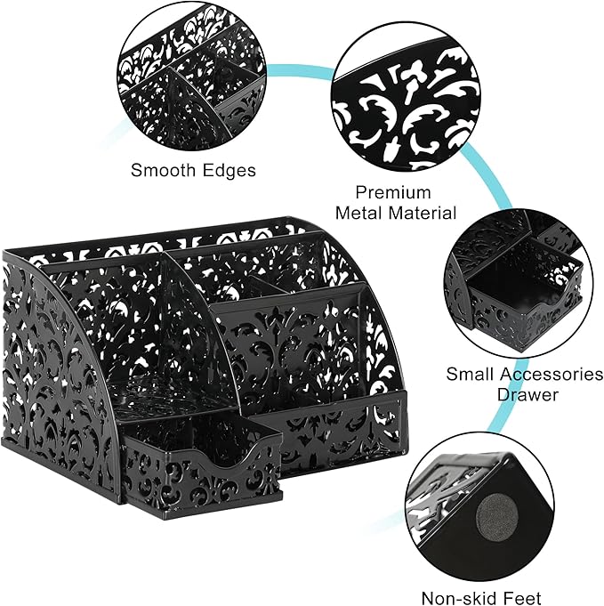 - Premium Metal Build: Made of metal with hollow flower patterns and anti-rust powder finished, this desk caddy combines elegance with functionality. Smoothed edges and a chip-resistant coating ensure long-lasting beauty.