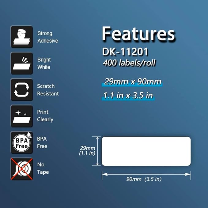 - Multi-purpose Labels: 1.1 x 3.5 inch (29mm x 90mm) multi-purpose labels replace for for Brother DK-1201 are mainly used as standard address labels. Barcode labels and FNSKU labels are also applicable. Widely used on packages, envelopes, mails, letters, parcels, signs and temporary name tags.