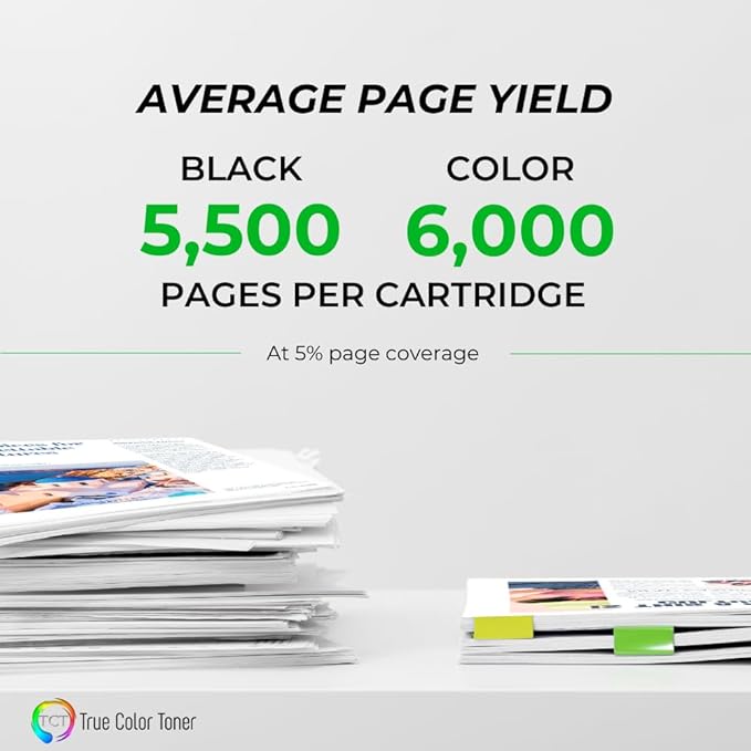 - Page Yield: Up to 5500 pages per black cartridge and 6000 pages per color cartridge at 5% coverage (Letter/A4).