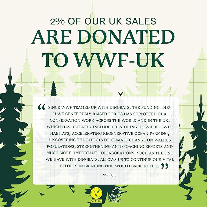 - For its UK sales, Dingbats* Notebooks Ltd donates 2% of its revenue to WWF-UK, a charity registered in England and Wales (1081247)
