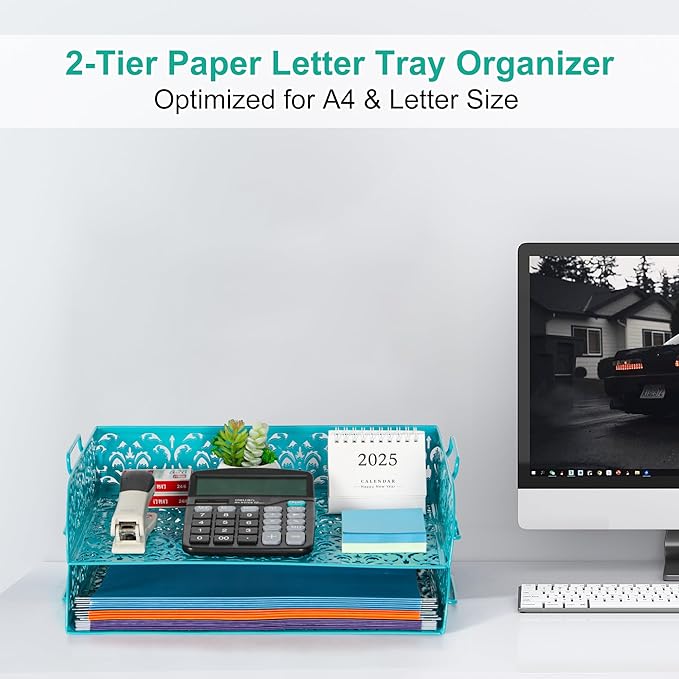 EasyPAG Paper Organizer for Desk 2 Tier Stackable Paper Tray for A4 Legal Size Folders Metal File Storage Desktop Organizer for Home Office School Teacher, Dark Teal