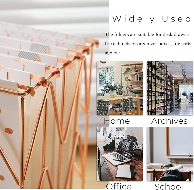 - Gold Foil Design - Unlike traditional file folder, our rose gold foil of hanging file folder and tabs can match the gold desk organizer, and bring fashion and a modern atmosphere to your desk, create a more luxurious and elegant space