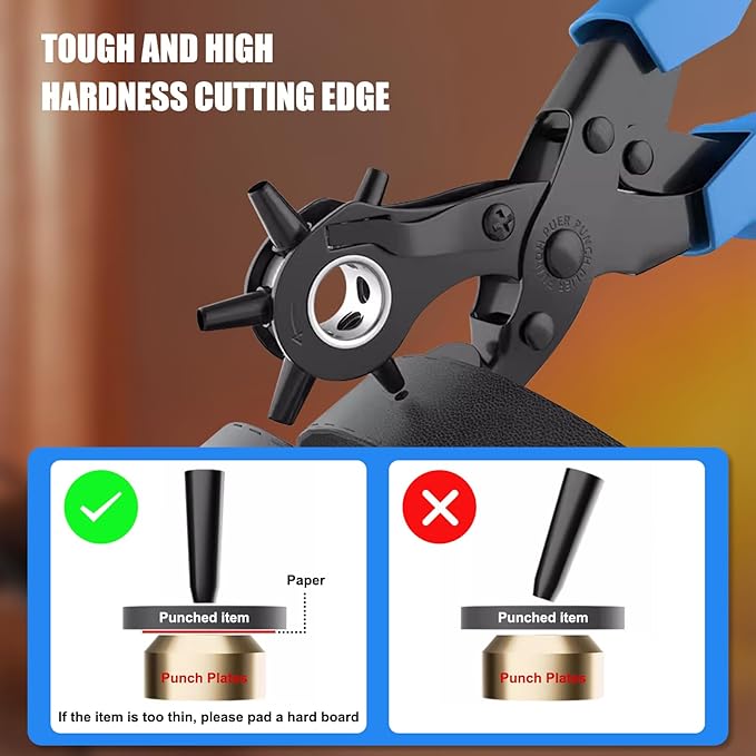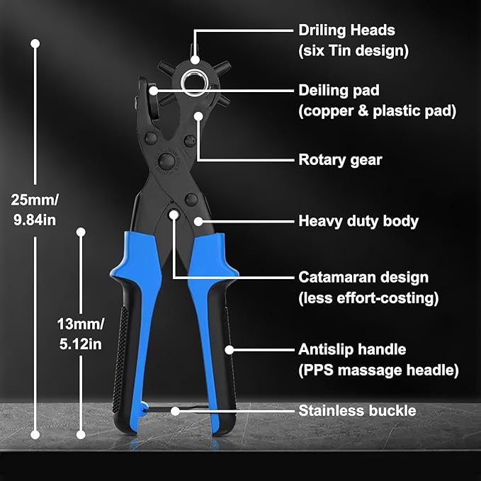 - 【Size Marked & Multifunction】6 different rotatable sized holes heads : 2 mm, 2.5 mm, 3 mm, 3.5 mm, 4 mm and 4.5 mm. Widely used for punching round holes in leather, belts, plastic, rubber, canvas, fabric, cloth, cardboard, saddles, and similar materials; especially for leather. Only choose the right size, rotate the wheel, align your belt and squeeze, and then -- you own an almost new belt fits your body perfectly! SO EASY