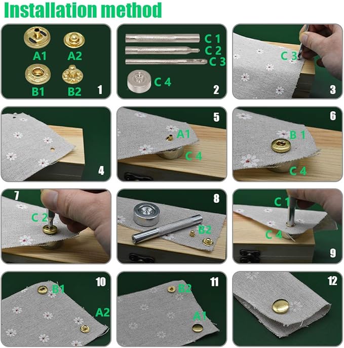 - For punch hole and install snap fasteners, press studs, rivet, grommet, etc