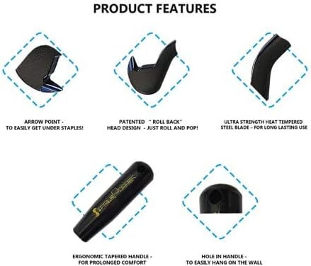- Unique Design & Durable - This tool was designed specifically to remove carpet staples from stairs. Its custom patented design is makes it the undisputed fastest tool in its class! There are no moving parts. While some staple removers have levers and other little gadgets, ours is a single piece of hardened steel attached to a heavy-duty handle. Built tough and designed to last!