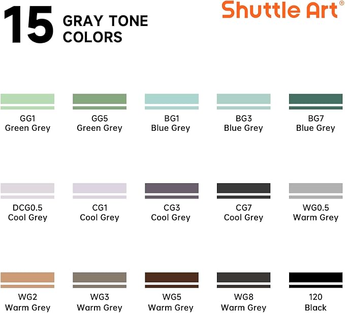 - Shuttle Art Gray Tones Dual Tip Alcohol Based Art Markers are assorted with 14 different gray colors and 1 black color. Gray colors set covers 4 cool grays, 2 green gray, 3 blue grays and 5 warm gray that meet people’s special requirements in gray tones. Markers are rated for 300 meters of continuous use which provide you a vast amount of ink per marker and are non-toxic and conforming to ASTM-D4236. They also resist fading over time. Perfect for use on paper, ceramics, glass, wood, cloth