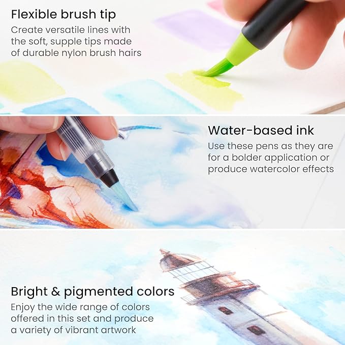 - Safe and Convenient Brush Pen Set: Enjoy the flexibility of watercolor painting without the mess. These non-toxic watercolor markers for adults offer the ease of a pen with the results of a paintbrush. They're a must-have for any artist's toolkit.