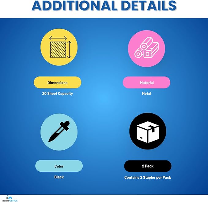 - Package of two office staplers is ideal for frequent use, as it can staple up to 20 sheets of paper at once. It provides a convenient way to staple larger documents together.