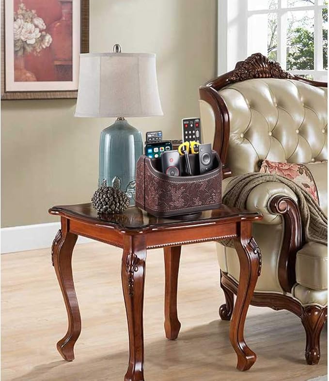 YAPISHI Antique Leather Remote Control Holder, 360 Degree Spinning Desk TV Remote Caddy/Box, Bedside Table Organizer for Controller, Media, Calculator, Mobile Phone and Pen Storage