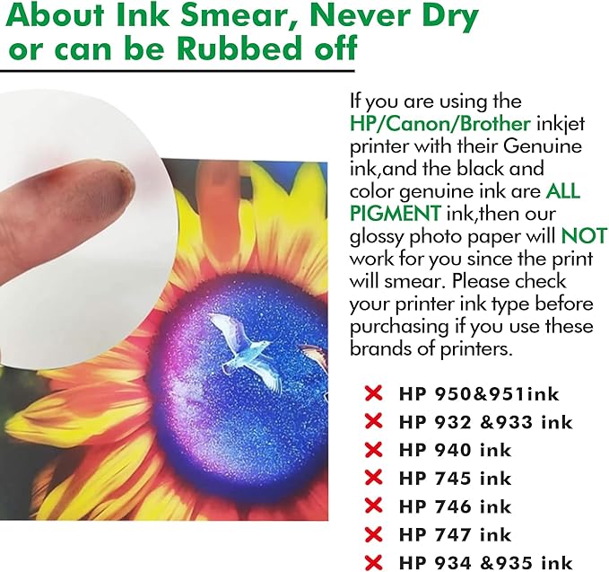 - IMPORTANT NOTE 1: Use only DYE ink to print. Pigment ink will smear and not dry properly on this double sided glossy paper. This paper is not compatible with HP 745/746/747 950/951/932/933/934/935/940 ink