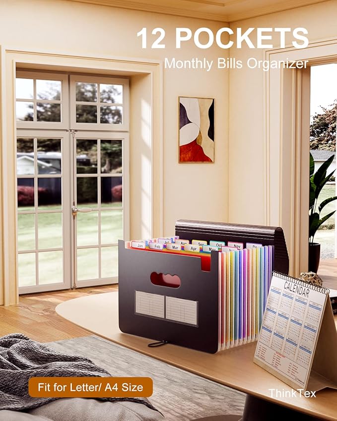 ThinkTex Expanding File Folder 12 Pockets Accordion File Organizer/Portable Expandable Plastic Filing Box, Accordion Bill/Paper/Document/Receipt Organizer Folders with Colored Tabs(A4/Letter Size)