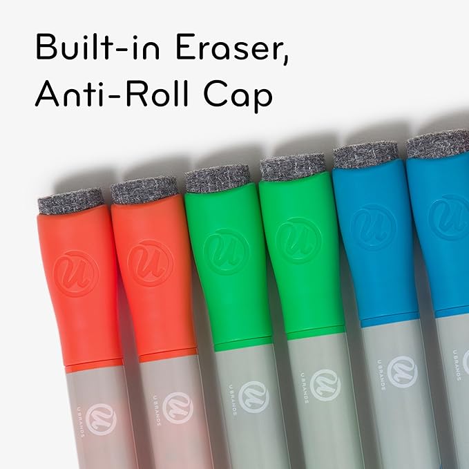 - QUICK CORRECTION CAP: Make corrections a breeze with the built-in felt erasers on the caps that allow for clean erasing without residue; featuring a contoured anti-roll cap shape, which prevents the markers from rolling off any flat surface or tray