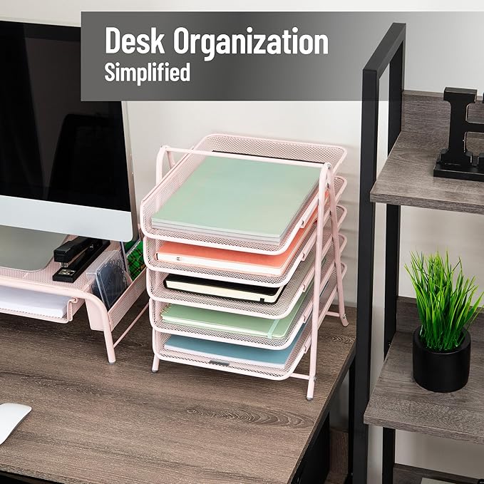 Mind Reader 5-Tier Paper Tray Organizer, Vertical Desktop File Storage Rack, Office, Metal Mesh, Pink