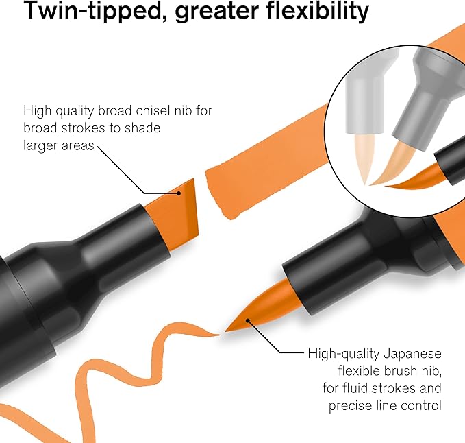 - DUAL TIPS: All graphic markers have a brush tip for full coverage and a broad chisel nib for a variety of line widths