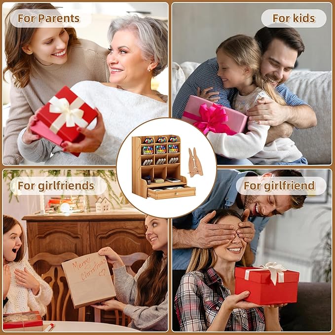 - 【STRONG & STURDY ORGANIZER】: Made of environmental friendly wood board materials,sturdy construct,safe and nontoxic. Assembled chimeric design, Strong and durable. Superb craftsmanship with specially varnished for glossy surface ,excellent touch feeling and funny DIY design makes it be a perfect gift choice .The desktop organizer shelf is easy to clean and can protect from dust and water.