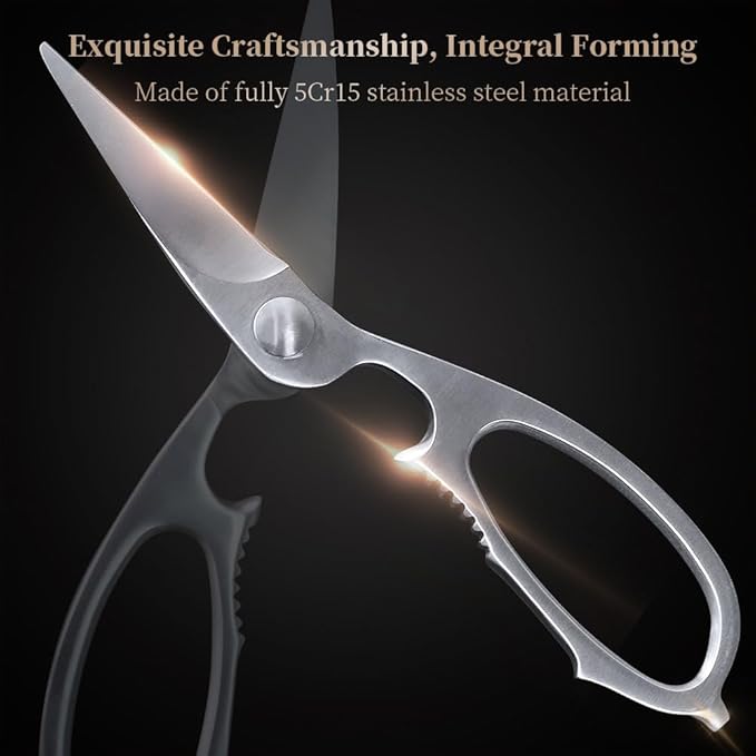 - 【Premium Quality Ultra-Sharp Poultry Shears】Multi-function tool combines 5 functions in 1 - Equipped with scissors, nutcracker, bottle opener, pry shells and scraping fish scales. The sharp kitchen shears have great flexibility, operability and are more cost-effective and maneuverable than a cutter.
