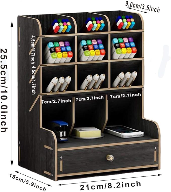 Marbrasse Wooden Desk Organizer, Multi-Functional DIY Pen Holder, Organizer for desk, Desktop Stationary, Easy Assembly, Home Office Art Supplies Storage with Drawer (B11-Black)