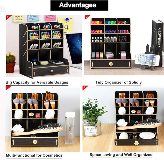- 【CREATIVE DIY DESIGN】: This Desktop organizer needs to be assembled By Yourself, it's full of the joy when you assemble the desktop organizer . Installation according to the instructions or video is very simple ,made up of 15 boards to assemble,fix it with screws. A single man can easily assembly it within 20 minutes. Instantly turn it into an eye-catching stationary