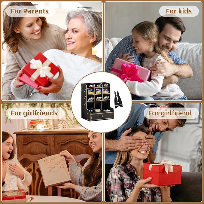 - 【STRONG & STURDY ORGANIZER】: Made of environmental friendly wood board materials,sturdy construct,safe and nontoxic. Assembled chimeric design, Strong and durable. Superb craftsmanship with specially varnished for glossy surface ,excellent touch feeling and funny DIY design makes it be a perfect gift choice .The desktop organizer shelf is easy to clean and can protect from dust and water