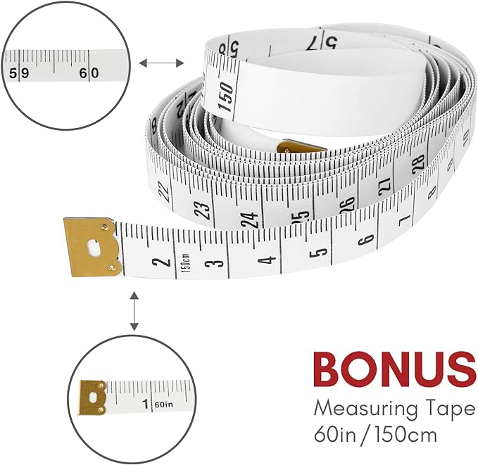 - BONUS MEASURING TAPE: Flexible and portable measuring tape, made from soft plastic material, white color, suitable for measuring curved or flat surfaces, dual sided to show inches and centimeters, measuring range is 60 inches / 150cm.