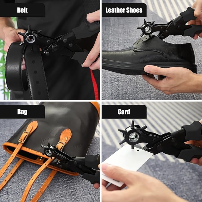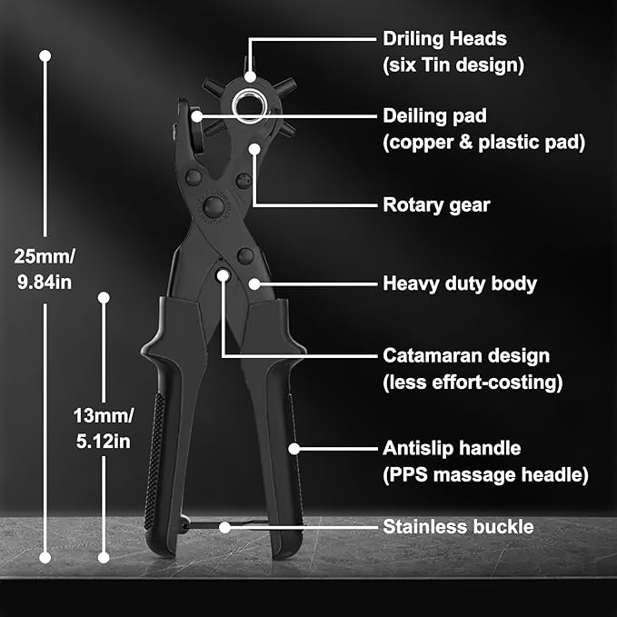 - 【Size Marked & Multifunction】6 different rotatable sized holes heads : 2 mm, 2.5 mm, 3 mm, 3.5 mm, 4 mm and 4.5 mm. Widely used for punching round holes in leather, belts, plastic, rubber, canvas, fabric, cloth, cardboard, saddles, and similar materials; especially for leather. Only choose the right size, rotate the wheel, align your belt and squeeze, and then -- you own an almost new belt fits your body perfectly