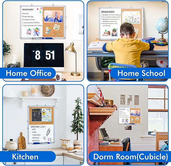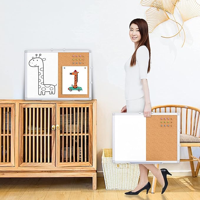 - Dual Functionality: This board features a 24 x 18 inch surface with half a dry erase board and half a bulletin notice board. The dry erase side offers a smooth, easy-to-clean surface that resists staining, while the cork bulletin board is self-healing, allowing you to pin and unpin items without causing damage