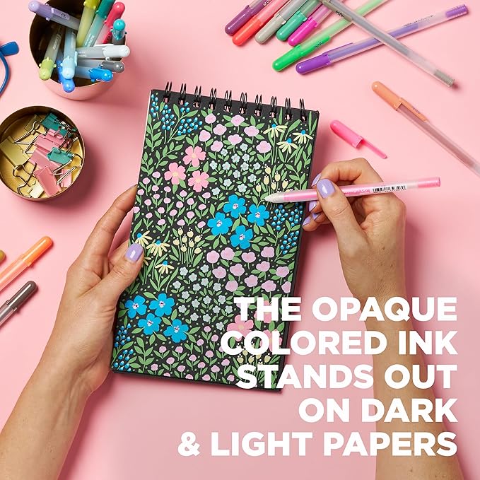 - Vibrant Opaque Ink: Gel pens have paint-like colored ink that creates a creamy smooth mark on light and dark paper.