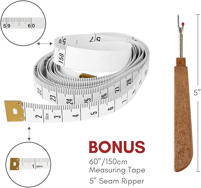 - PREMIUM SCISSOR SET: Professional 8” sharp all-purpose sewing scissors, one flexible and portable measuring tape, made from soft plastic material, white color, suitable for measuring curved or flat surfaces, dual sided to show inches and centimeters, measuring range is 60 inches / 150cm.And one seam ripper which is a pointed tool used to remove unwanted stitches, threads and to open a buttonhole.