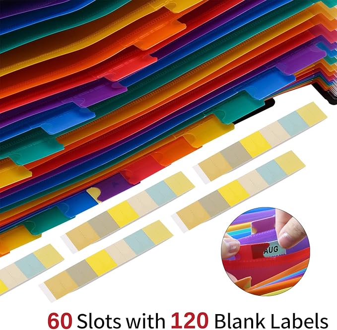 - Large Capacity Accordian File Organizer: The accordion file organizer keeps each slot's papers separated and organized in a good manner. 60 pockets expandable file folder gives it the possibility to hold approximately 6000 sheets A4 paper. Label the included blank tabs according to your habits to keep everything well organized and quickly accessible.