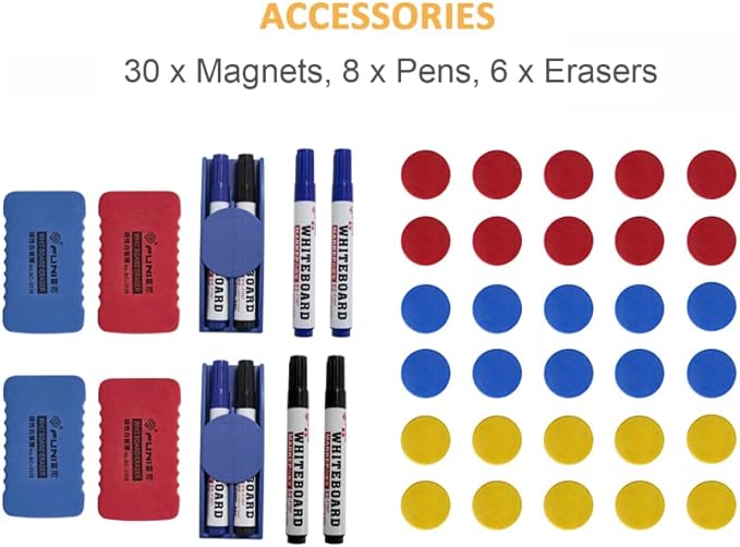 - [Strict Quality Control & 10mins Install]: Our whiteboard with stand, all the stands are machine integrated production, We stipulate that the distance between holes on each stand is the same, And before we pack the whiteboard, we will wipe every board clean and then pack it in plastic bags so that every board received by the customer will be clean, so every step is very strict, only need a few simple steps according to the instructions can be installed, It takes about 10-15 minutes to install.