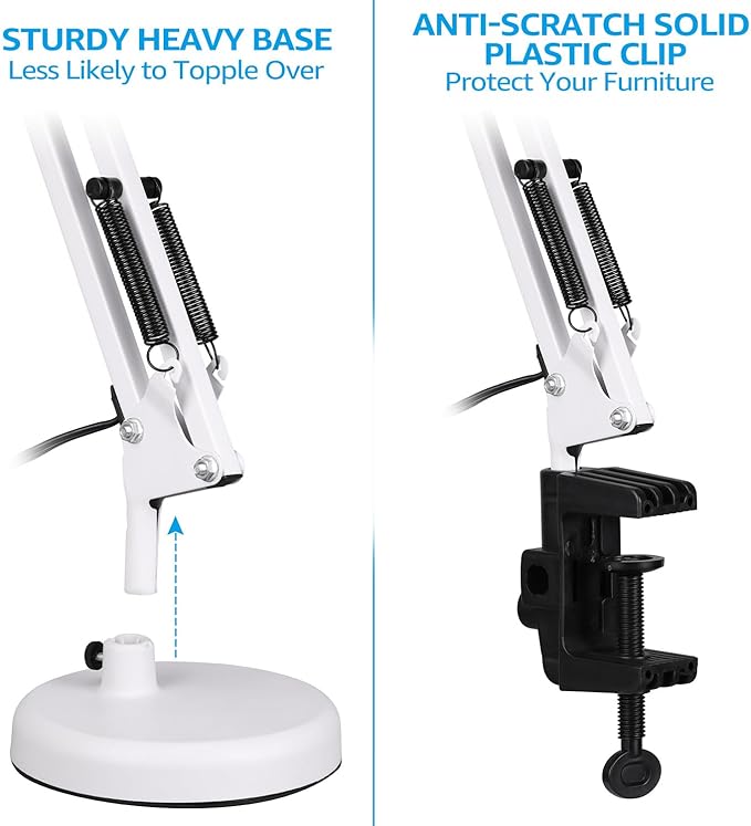 - PREMIUM QUALITY: The lamp stands firmly thanks to the weighted base and the swing arm and lamp shade are made from solid metal with a White finish, making them durable and exquisite to look at. The power plug is UL-listed, making it safe to use