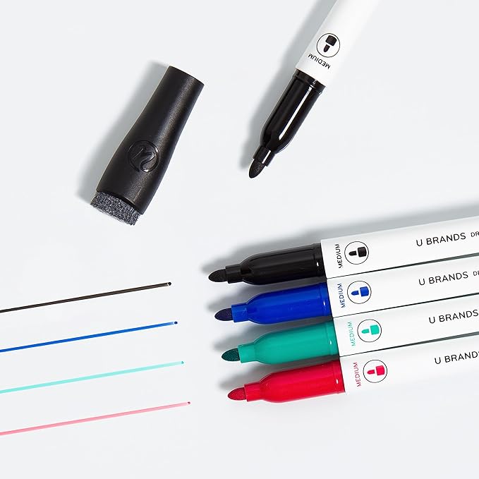 U Brands Fine Tip Dry Erase Markers with Eraser, Whiteboard Markers, Low Odor, Assorted Colors, Set of 12